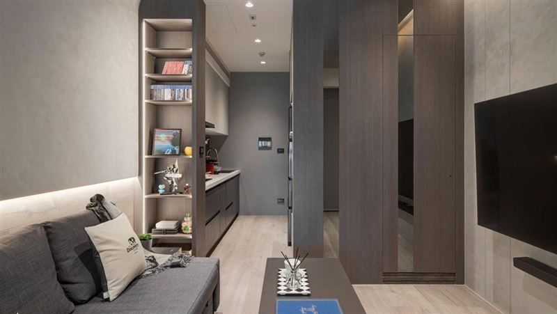 這是一間13坪的新成屋,規劃為1+1房1廳1衛。整體風格走現代簡約路線,以棕色木質、白色牆面與灰階地坪為主調,展現溫潤又理性的生活美感。